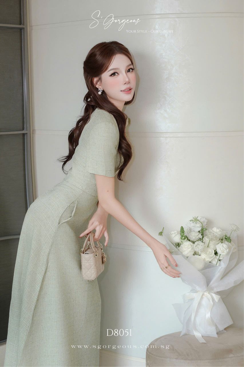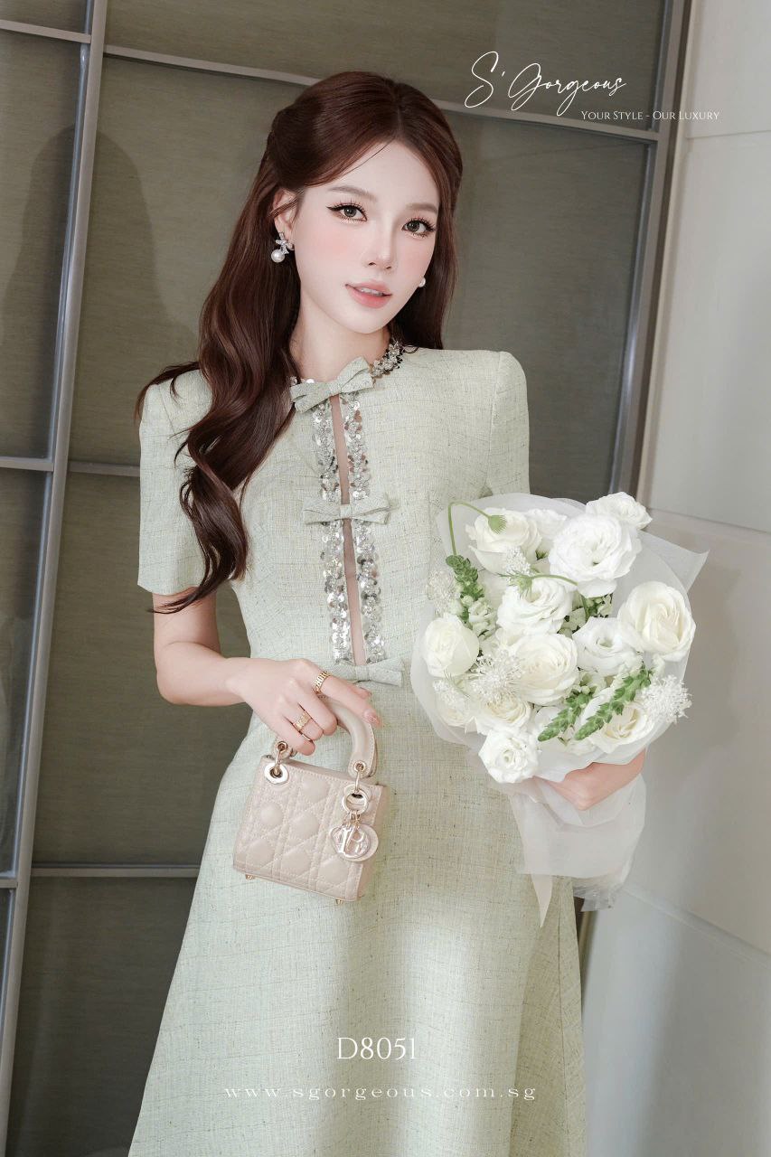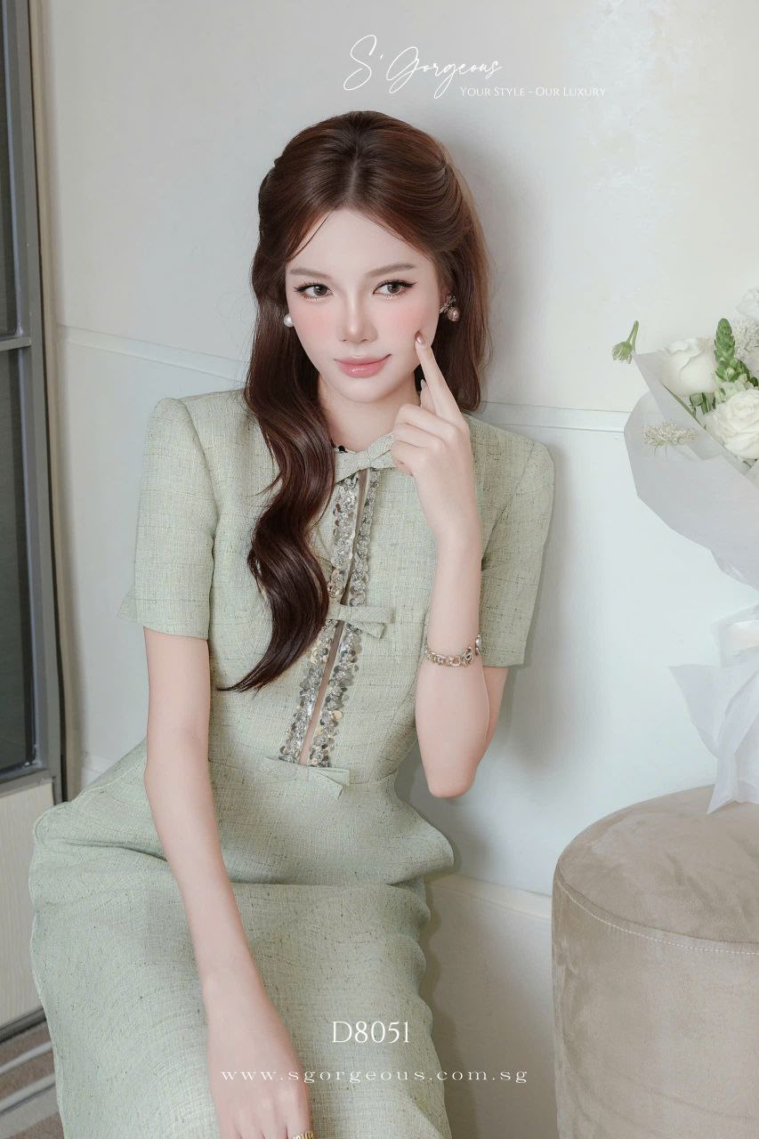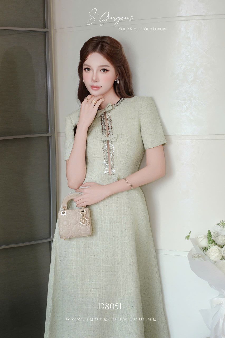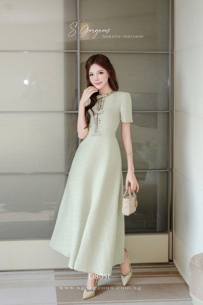 This mint midi dress features a refined silhouette, luxe textured fabric, and subtle embellished accents for that effortless quiet luxury look