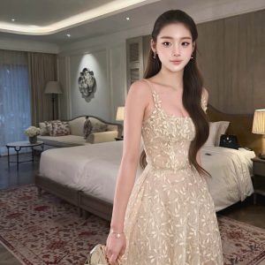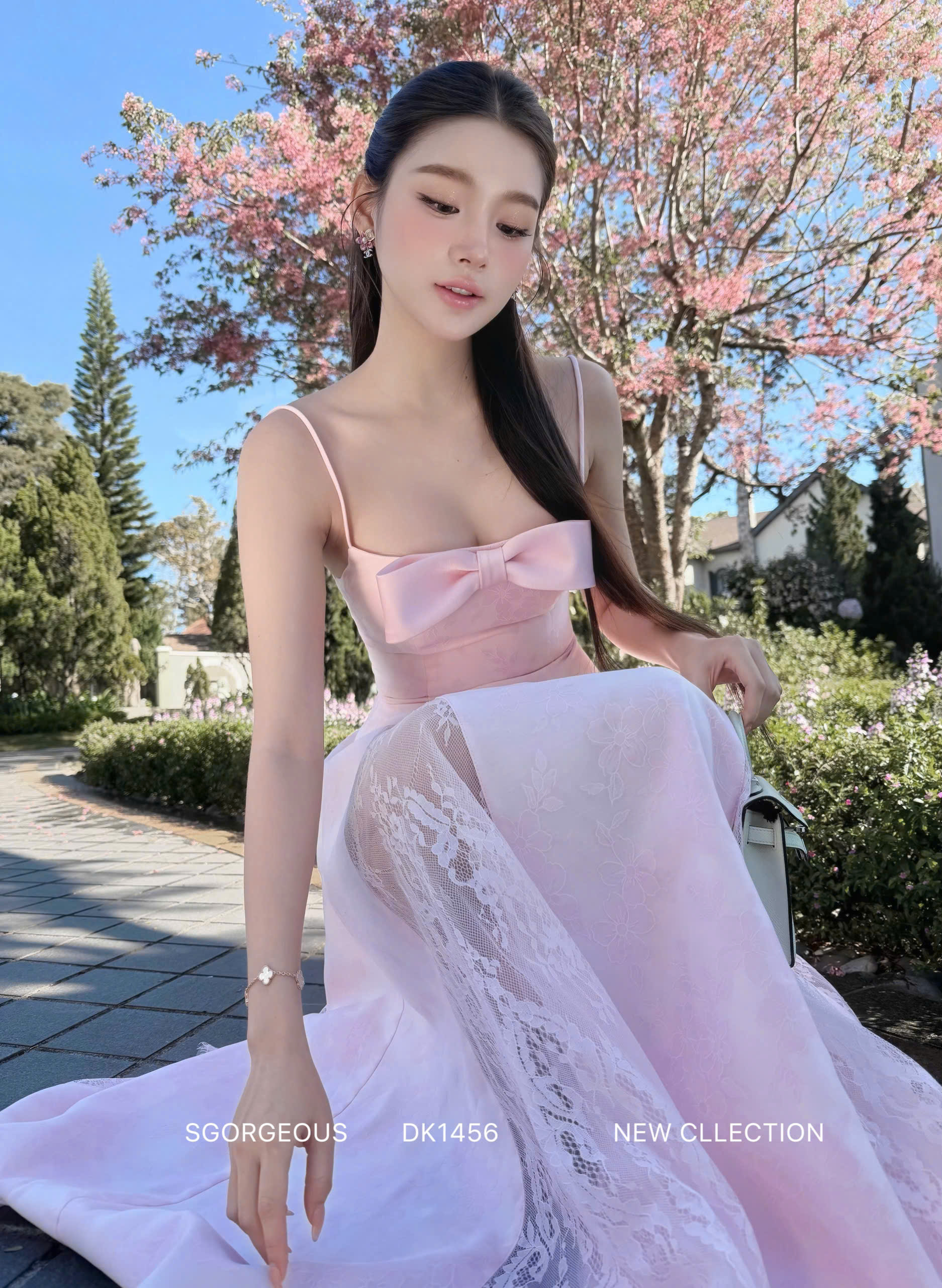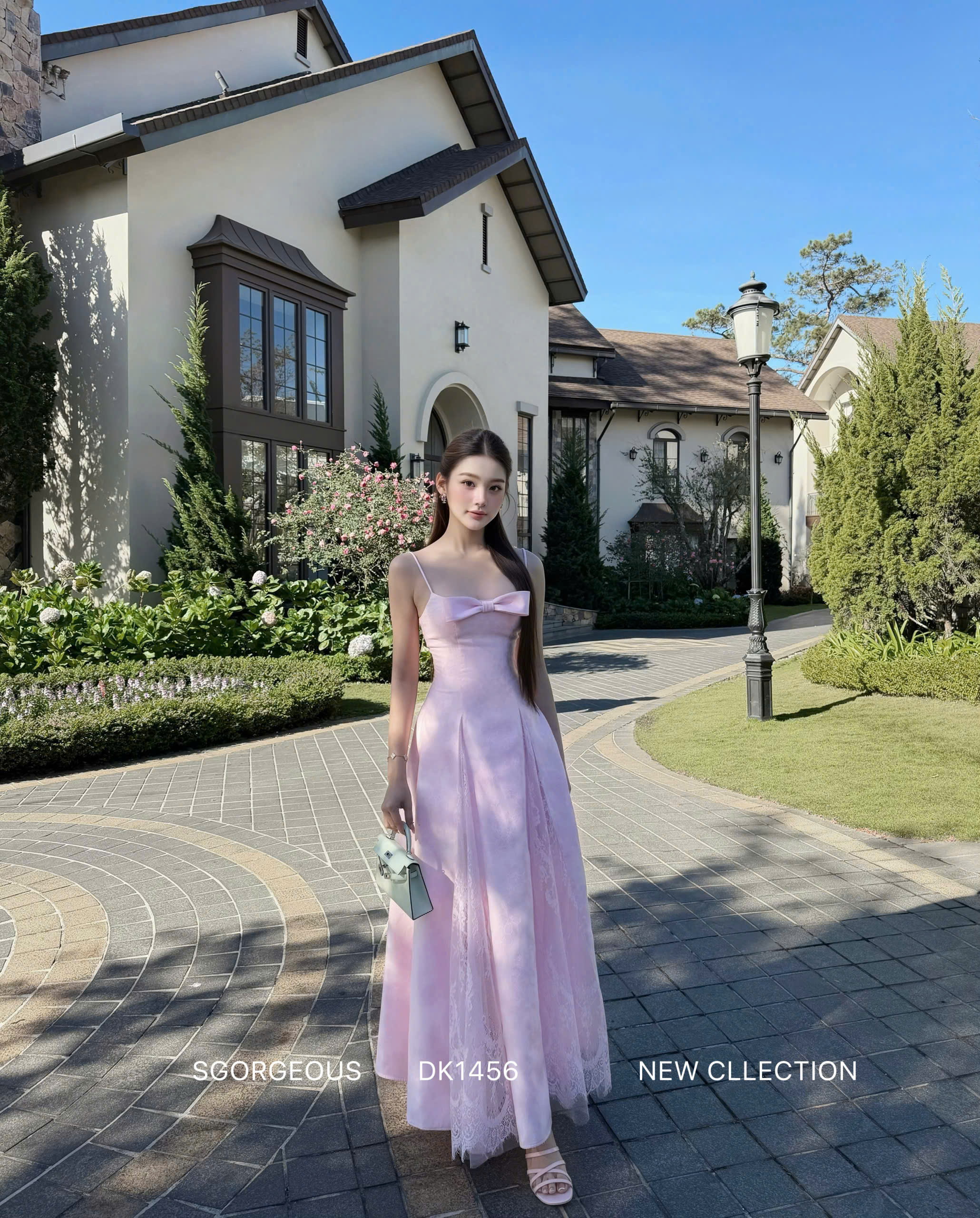 This blush pink maxi dress features a delicate bow neckline and a beautifully structured bodice that flatters the waist before flowing into a dreamy lace-trimmed skirt. Light, feminine, and timeless — it moves with quiet elegance.
