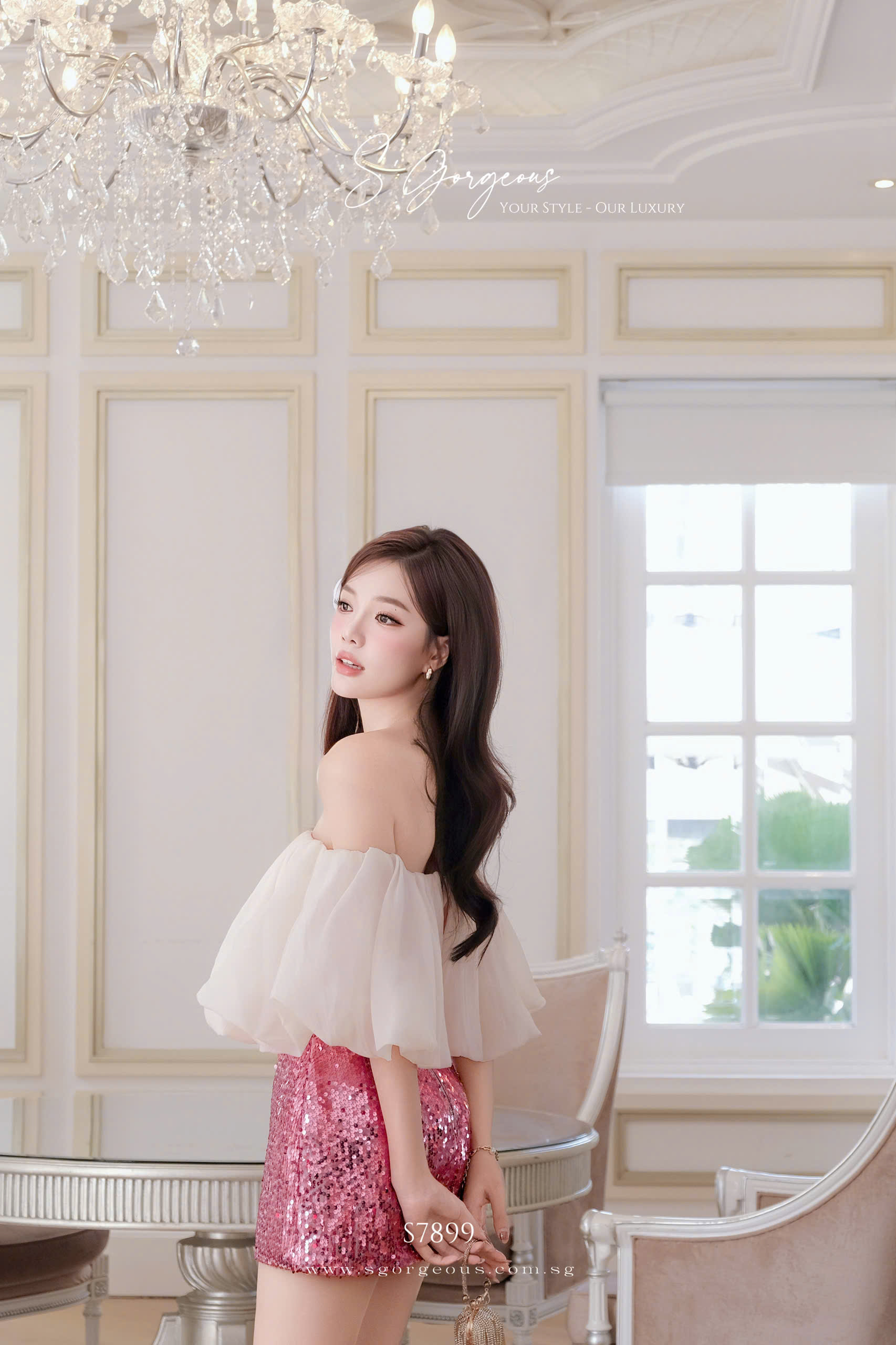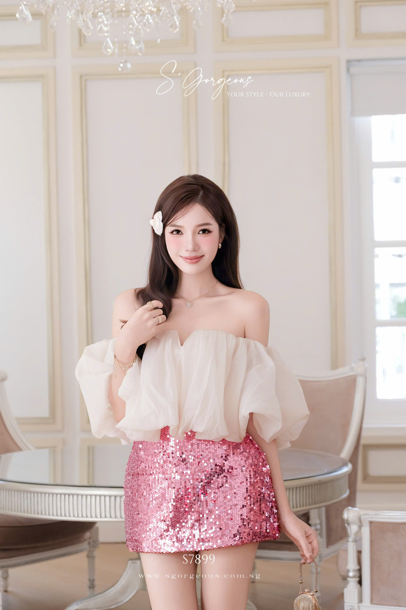 Refined two-piece set featuring a soft off-shoulder tulle top with gentle draping that frames the neckline beautifully. Paired with a fitted sequin bottom that adds subtle sparkle and shapes the silhouette elegantly. Feminine, flattering, and effortlessly luxurious—perfect for evenings, celebrations, and special moments ✨